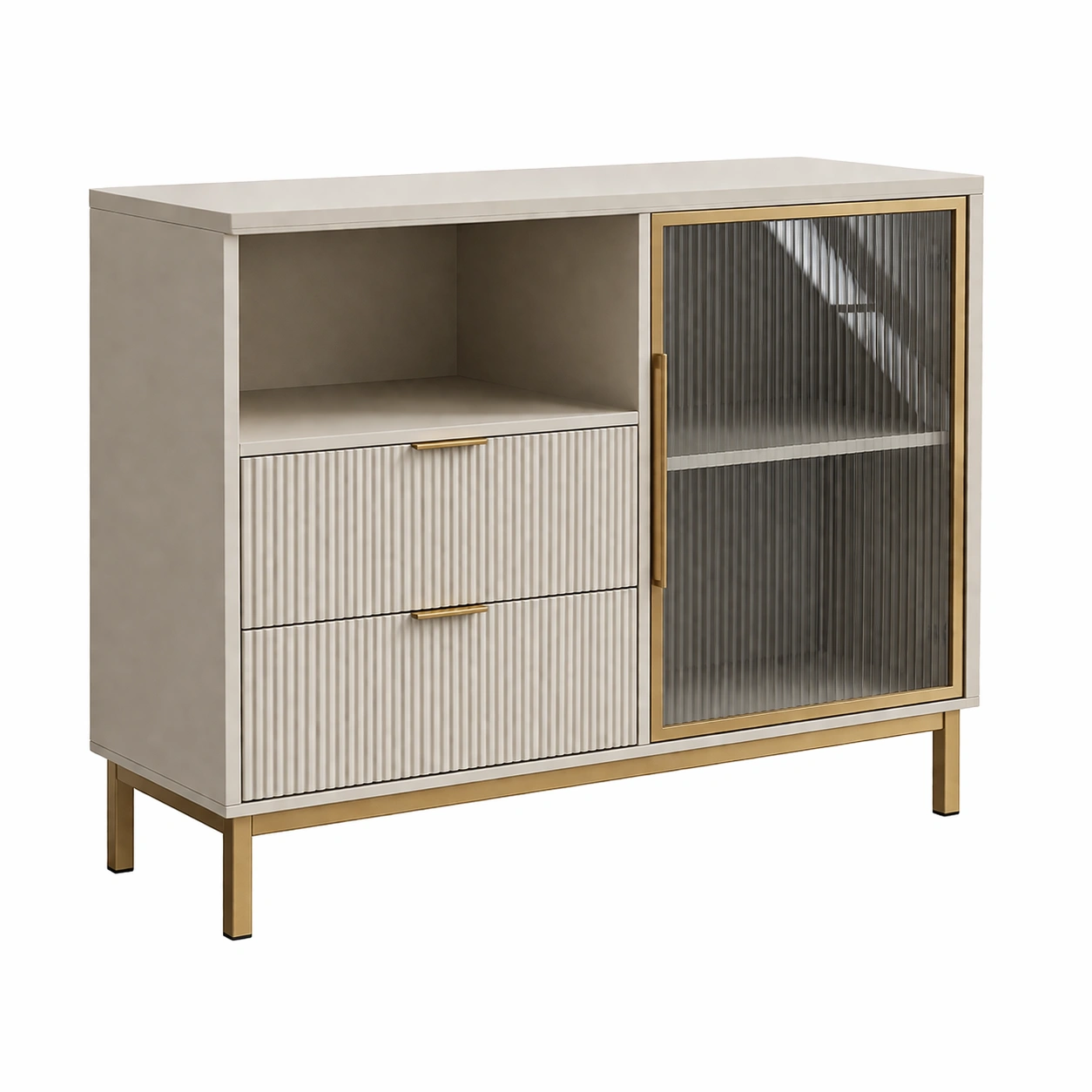 - Materiales: estructura de madera contrachapada, puerta de vidrio templado estriado de 5 mm, patas de metal con acabado dorado
